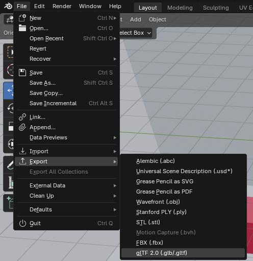 The simulator uses the glTF format, so export your scene as: File -> Export -> glTF 2.0 (.glb/.gltf):
