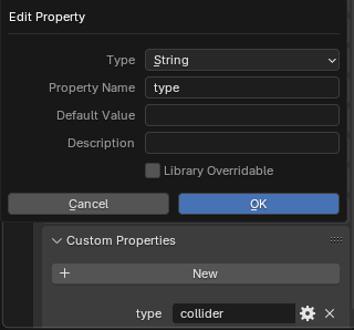 To add a collision to a mesh, assign a custom property. Select the object, go to Data -> Custom Properties, and click New: